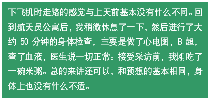 今天你刚刚从太空胜利返航,乘专机回到北京,现在的感觉怎么样?