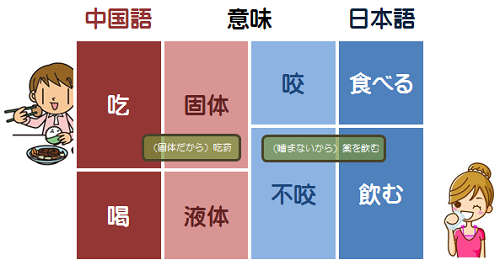 「吃」「喝」の違いは“固体か液体か”が分かれ目になるので同じ動作でも言い方が違ってくるだけなんです。