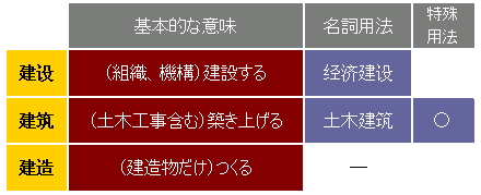 日本語の「建設」「建築」「建造」とは微妙に違いますから注意が必要ですよ。