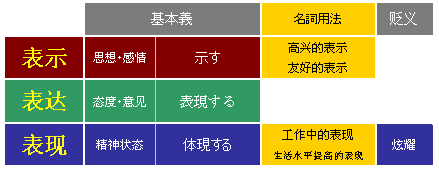 “表示”→“表达”→“表现”の順に、心の中の、より深い部分から表面に出てくるという感じがしませんか?