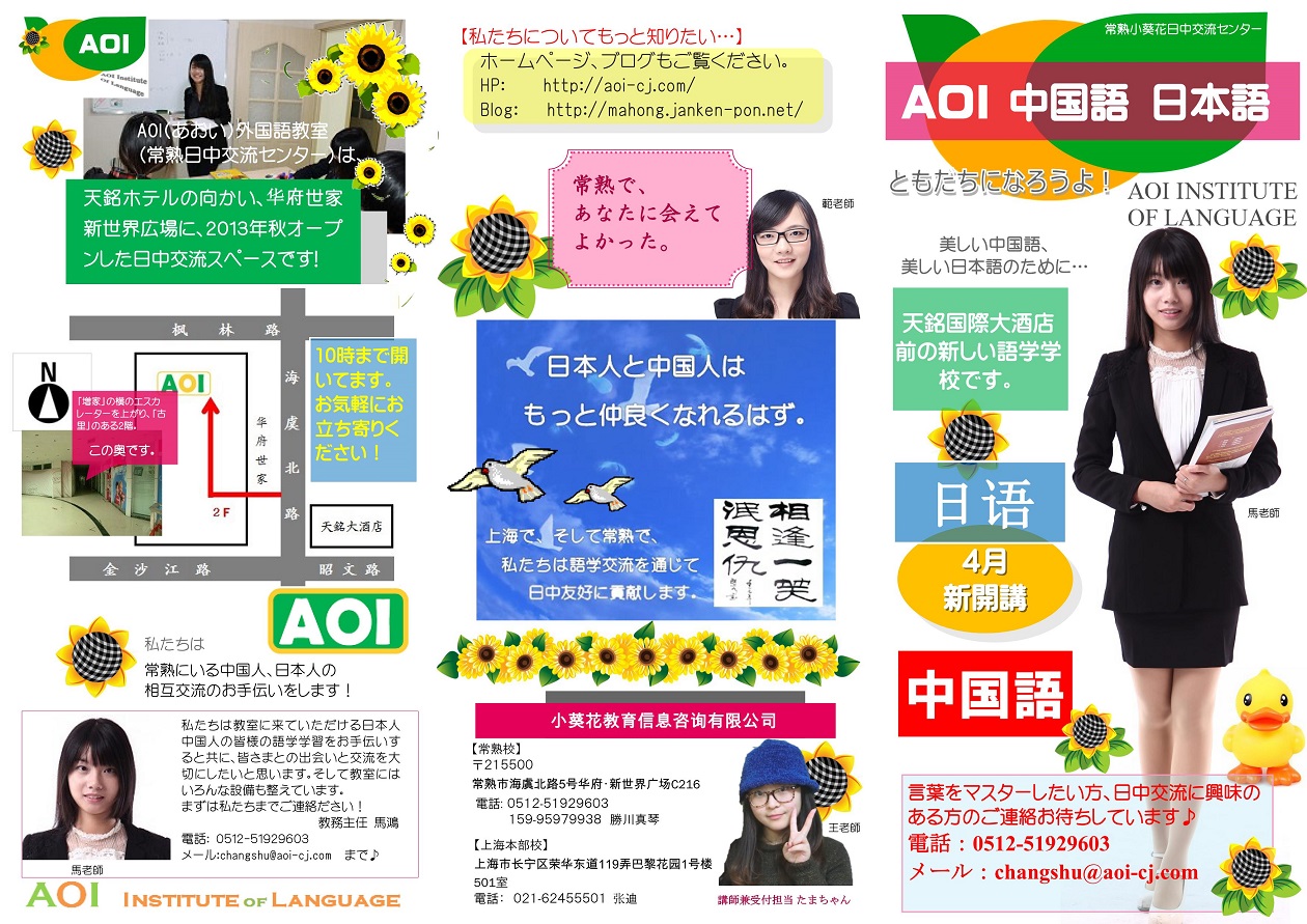 常熟で生まれて常熟で育ちました。AOI中国語は2013年11月に開校したに新しい常熟中国語学校です♪